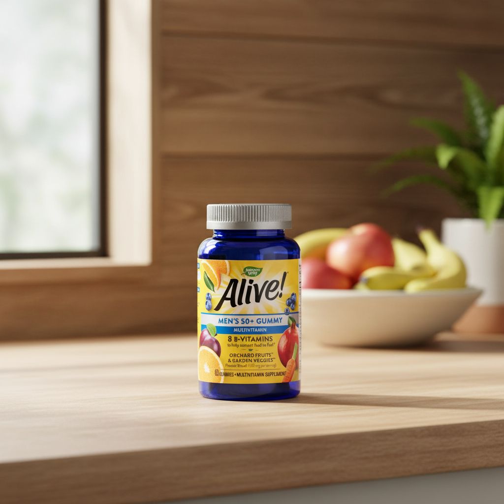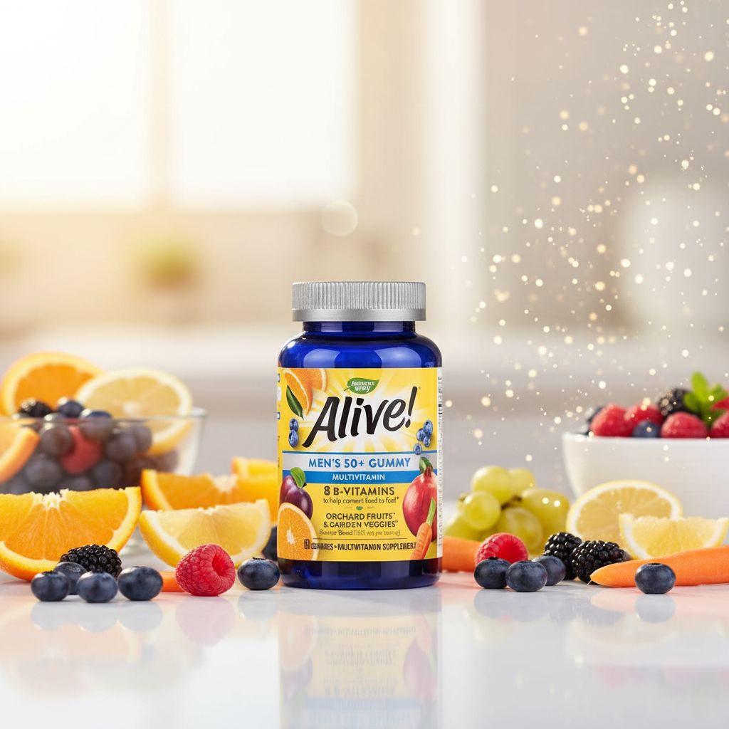 Alive! Men’s 50+ Gummy Multivitamin by Nature’s Way is a delicious natural berry gummy formulated for men aged 50+. Packed with essential vitamins, minerals, and antioxidants, it helps support energy, heart, prostate, eye, and immune health in a convenient and tasty form.