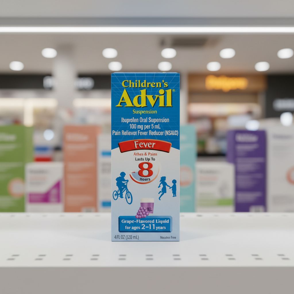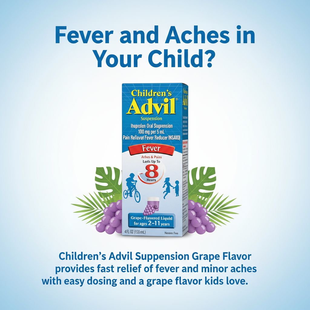 | Overview | Children’s Advil Suspension contains ibuprofen, a non-steroidal anti-inflammatory drug (NSAID) used to relieve pain and reduce fever. It helps manage common childhood discomforts such as headaches, toothaches, and minor body aches, and the liquid suspension allows accurate dosing and easy administration for children. |