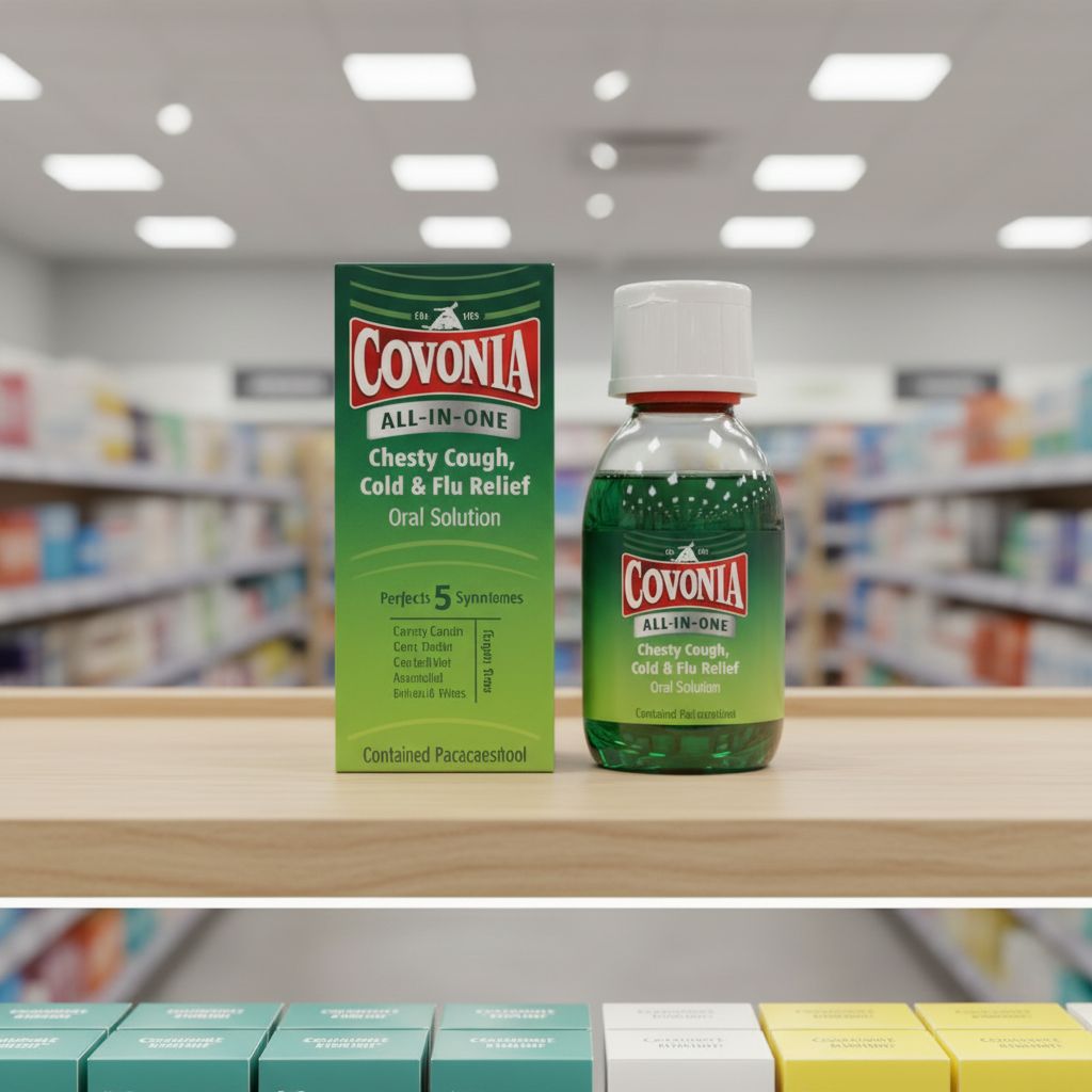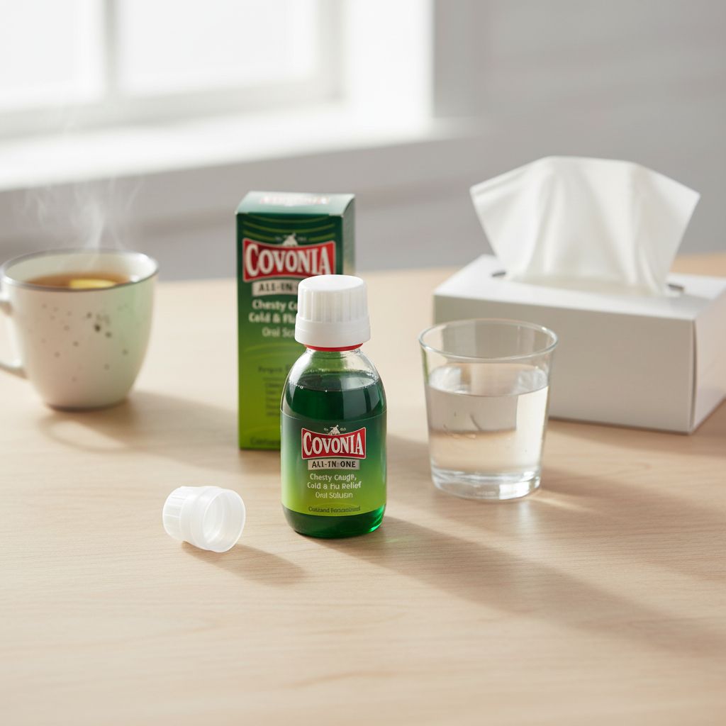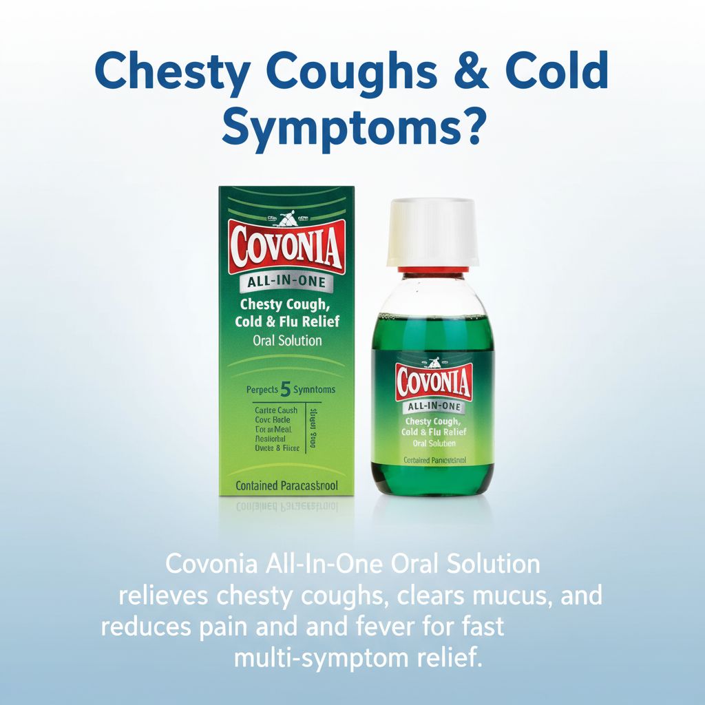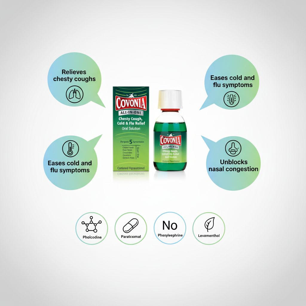 | Overview | Covonia All-In-One Oral Solution is designed to relieve symptoms associated with chesty cough, colds, and flu. The formulation helps loosen mucus and soothe irritated throat tissues, and the convenient liquid formulation provides easy dosing for effective relief. |