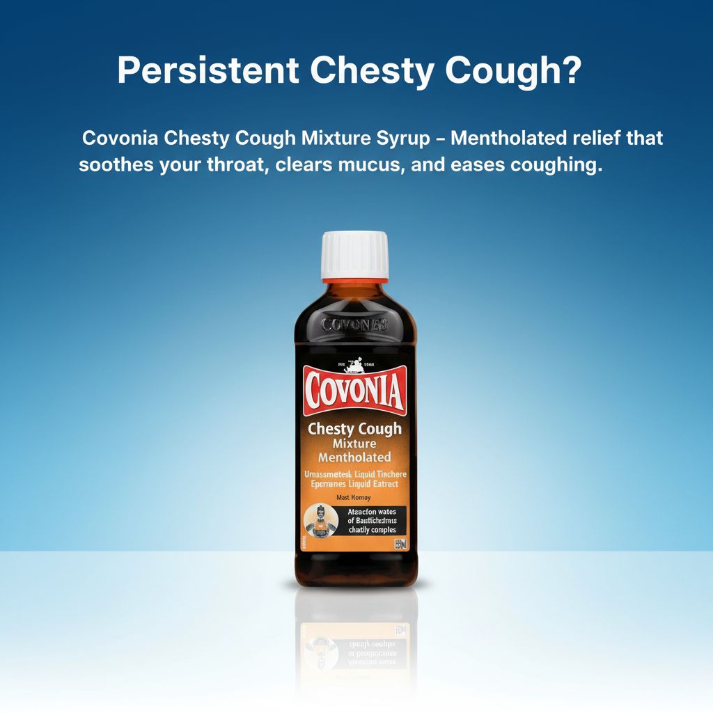 Overview Covonia Chesty Cough Sugar Free Syrup contains guaifenesin to help relieve chesty cough. The formulation works by thinning and loosening mucus in the chest, and the sugar-free, non-drowsy syrup is designed for effective cough relief.