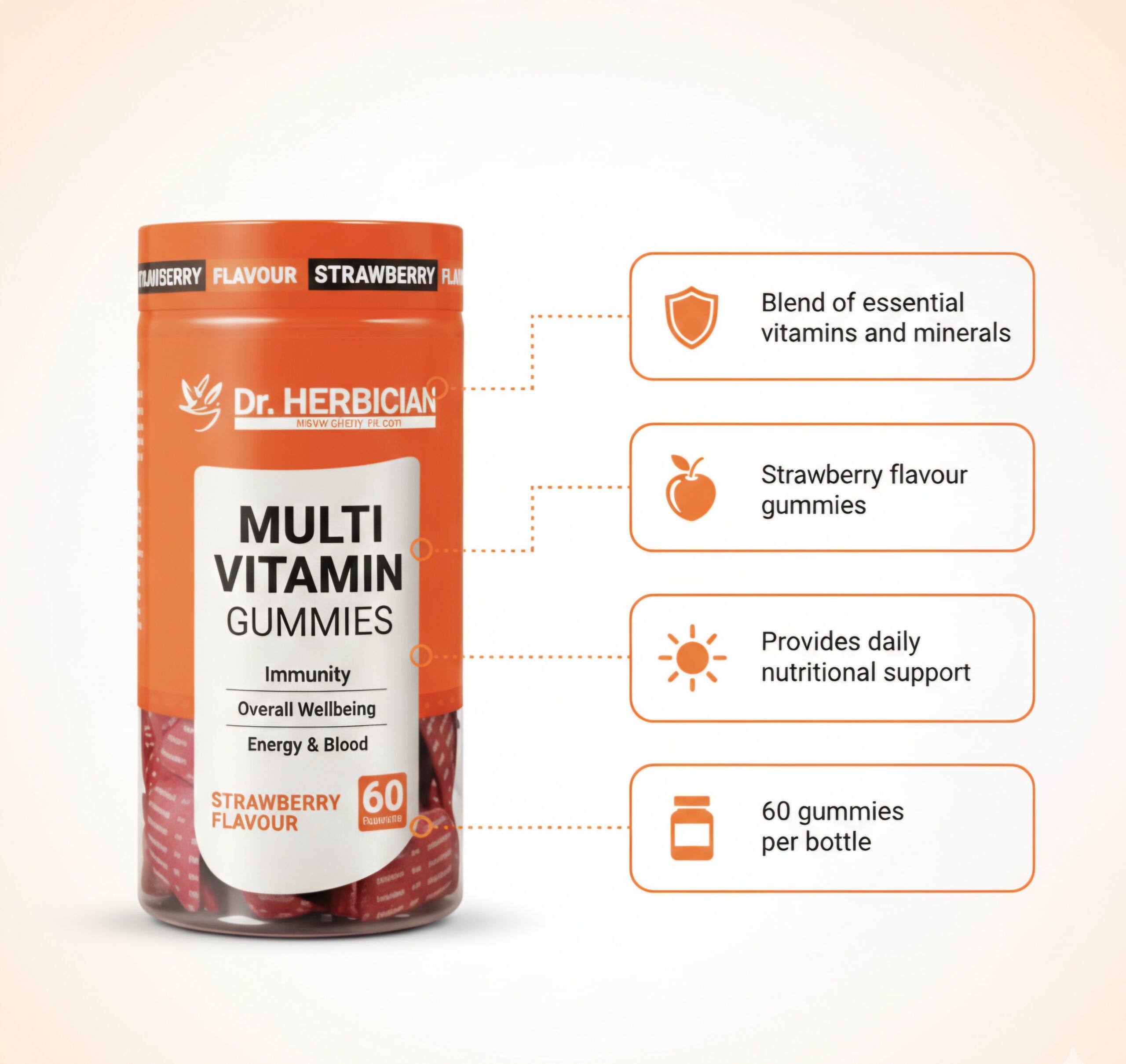 | Overview | Daily multivitamin gummies designed to support immunity, energy, and overall wellness. They include essential vitamins that aid metabolism and blood health and come in a pleasant strawberry-flavored chewable format. |