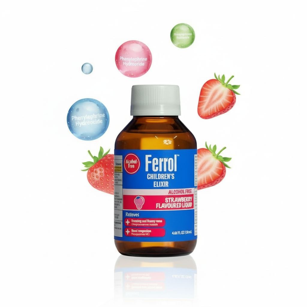| Overview | Ferrol Children’s Elixir is a pediatric cold relief syrup designed to ease multiple symptoms. The formula helps manage sneezing, runny nose, and congestion associated with colds or allergies, and the strawberry-flavoured liquid allows easier administration for children. |