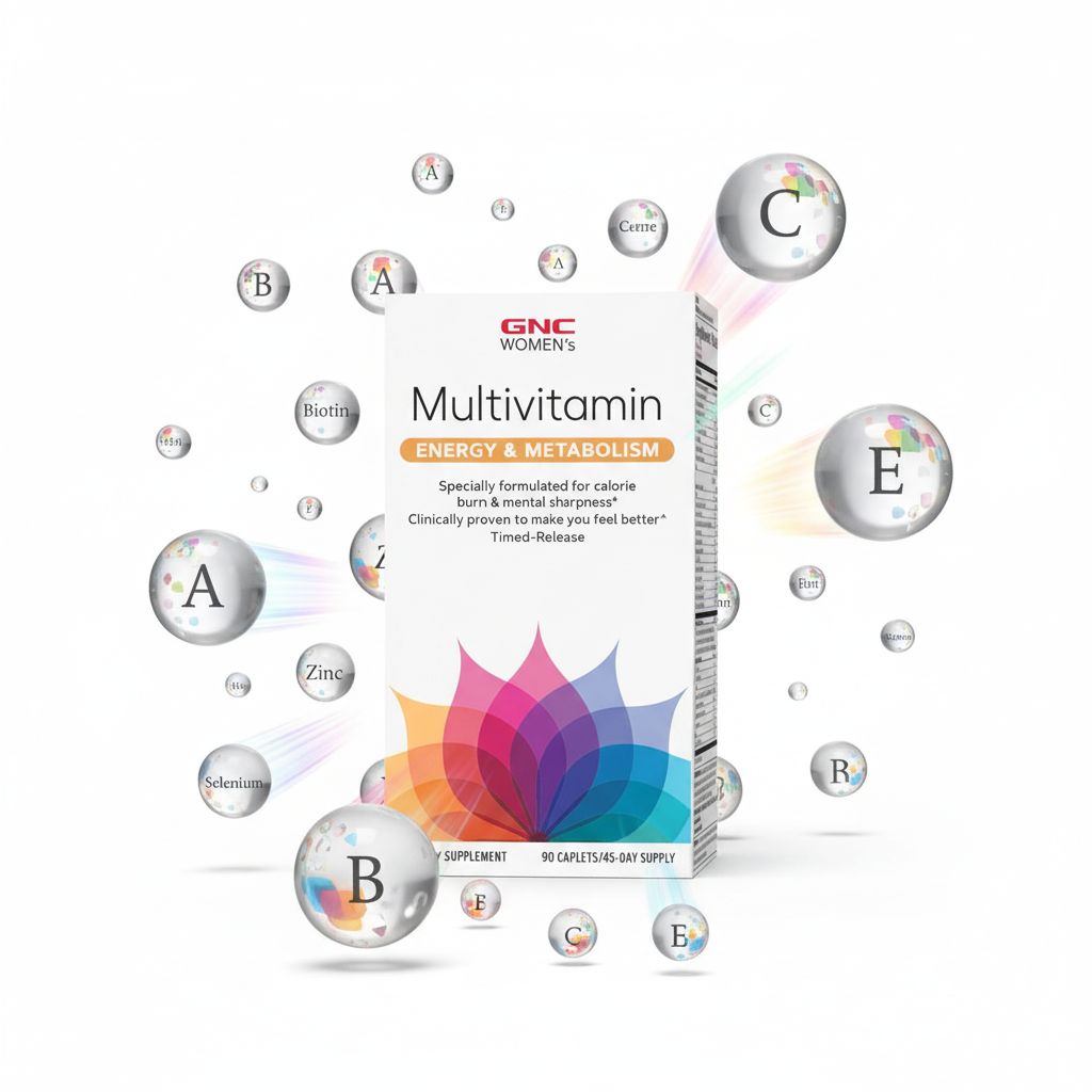A specially formulated women’s multivitamin designed to support energy, metabolism, and overall wellness. The timed-release formula ensures sustained nutrient delivery throughout the day.