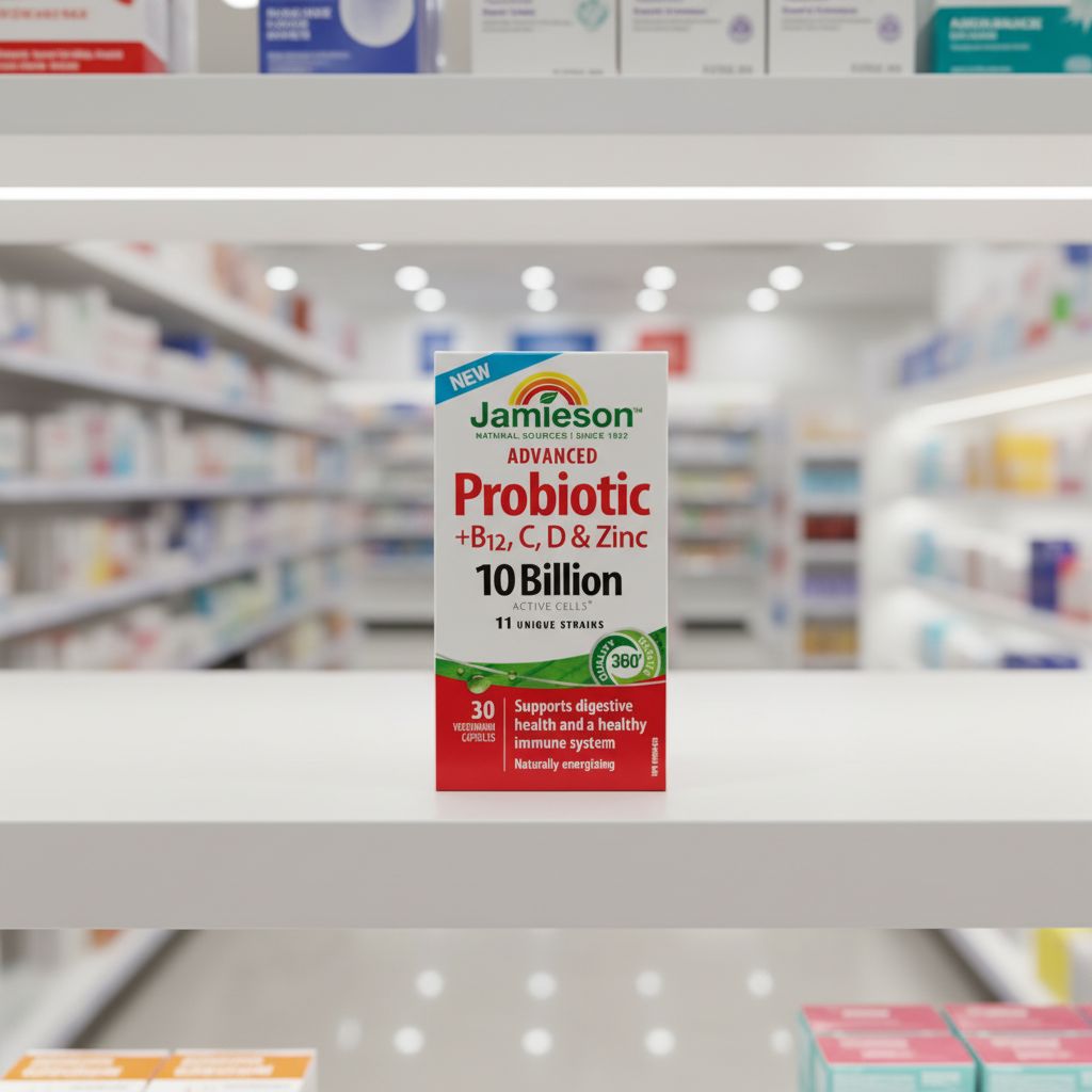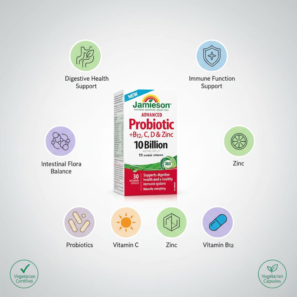 | Overview | Advanced probiotic formula combining beneficial bacteria with essential vitamins, delivering 10 billion active cells from 11 probiotic strains and enhanced with vitamins B12, C, D, and zinc for digestive and immune support. |