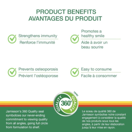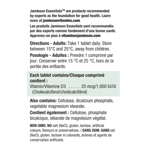 1000IU Vitamin D3 per tablet; Supports bone, immune, and muscle health