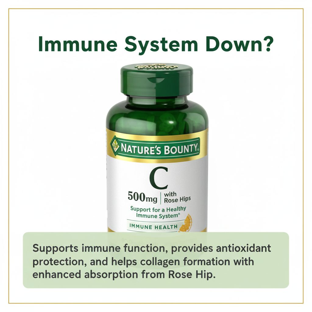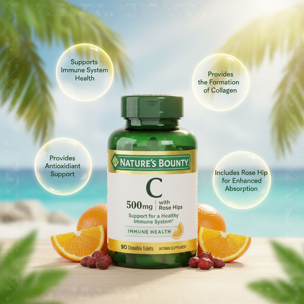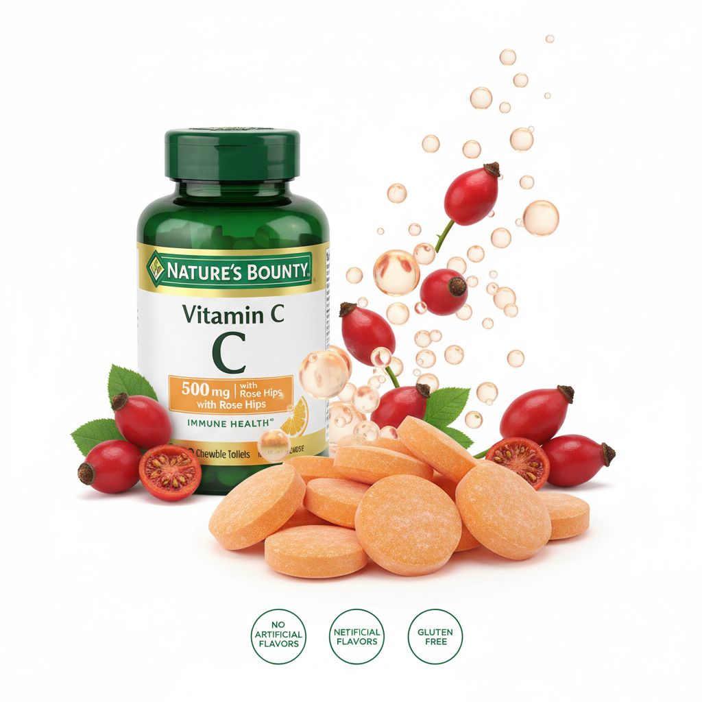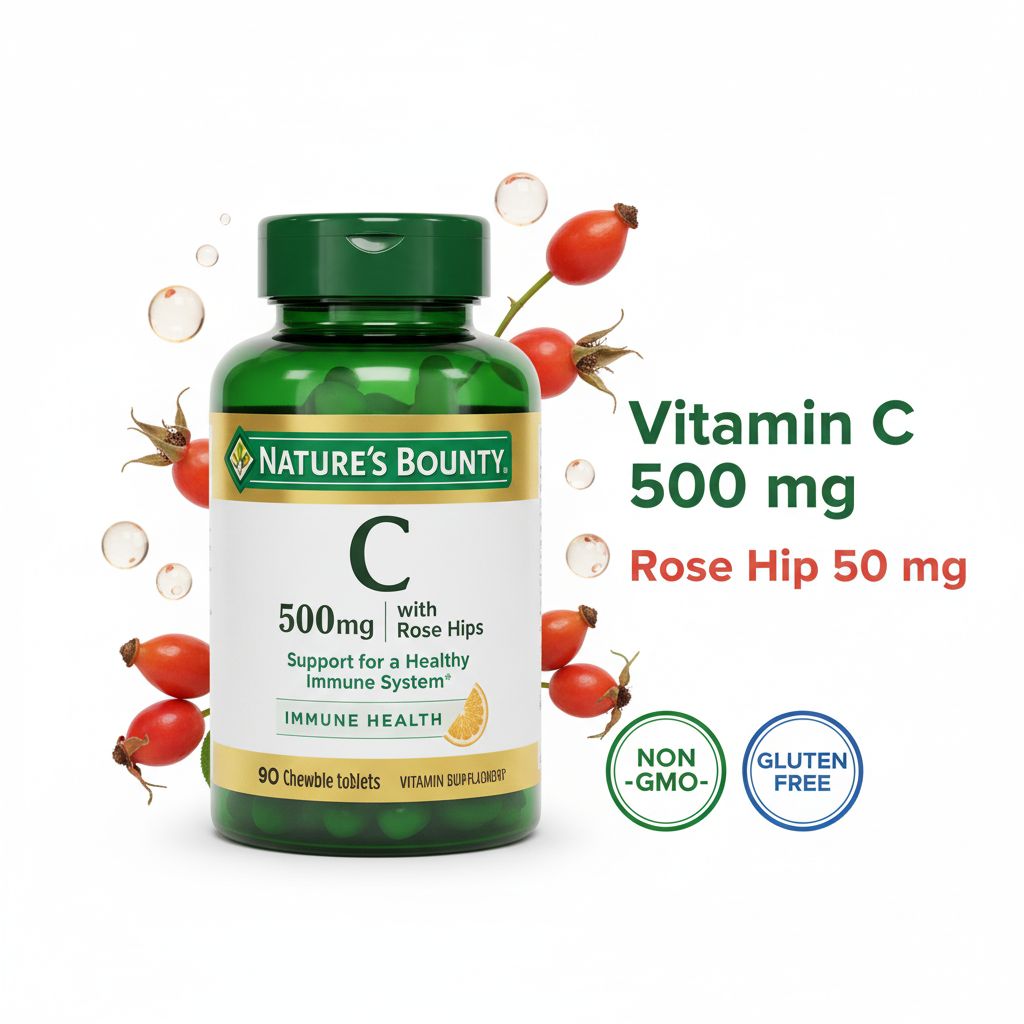 | Overview | Nature’s Bounty Vitamin C 500 mg with Rose Hips provides essential immune support in a convenient chewable form. Vitamin C acts as a powerful antioxidant that helps fight oxidative stress, while rose hips enhance overall antioxidant benefits for daily wellness. |