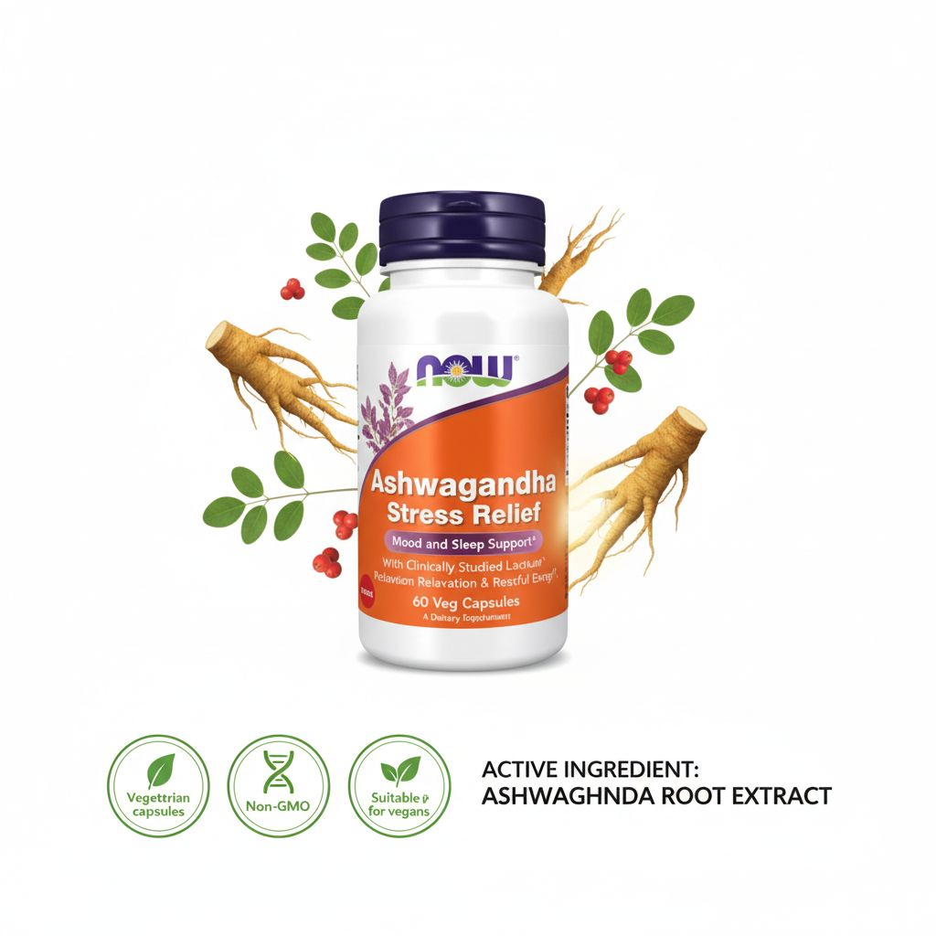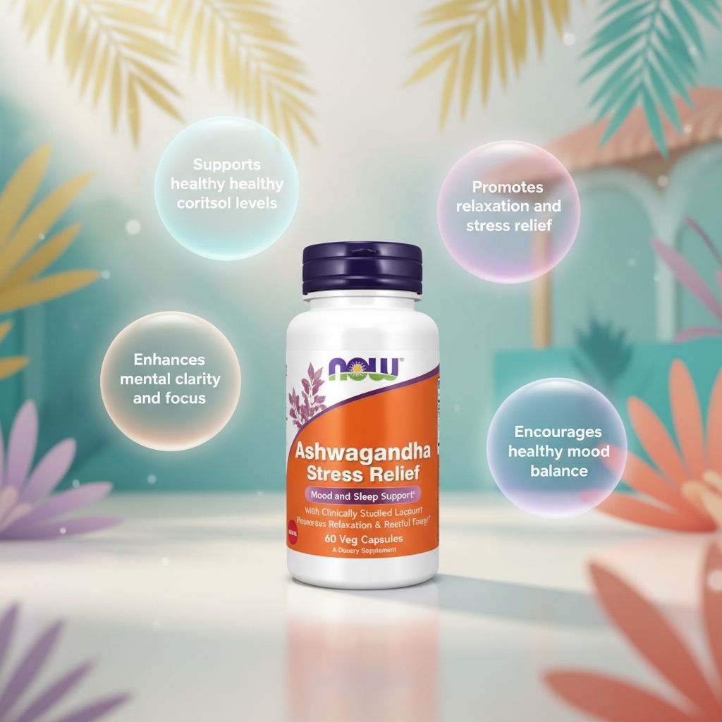 | Overview | NOW Ashwagandha Stress Relief combines clinically studied ashwagandha to help manage stress. Formulated to support relaxation, mood balance, and sleep quality. A natural option for everyday stress management. |