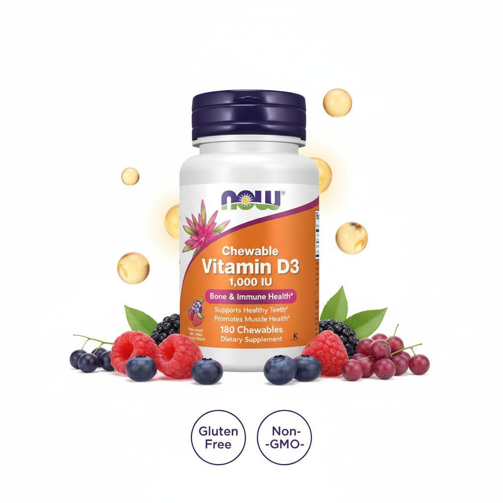 | Overview | NOW Chewable Vitamin D3 delivers a highly bioavailable form of vitamin D essential for skeletal and immune health. Vitamin D3 plays a vital role in calcium metabolism, helping maintain bone density and strength. A pleasant-tasting chewable option designed for those who prefer an alternative to capsules or softgels. |