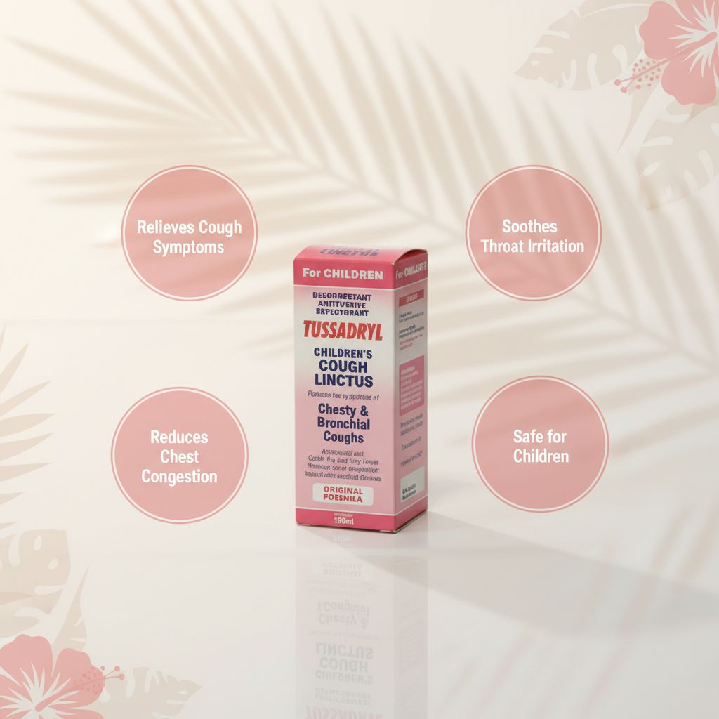 | Overview | Tussadryl Children’s Cough Linctus is formulated to relieve chesty and bronchial coughs in children. It works as an expectorant to help clear mucus, ease breathing, and provide relief from coughs associated with colds and flu. |
