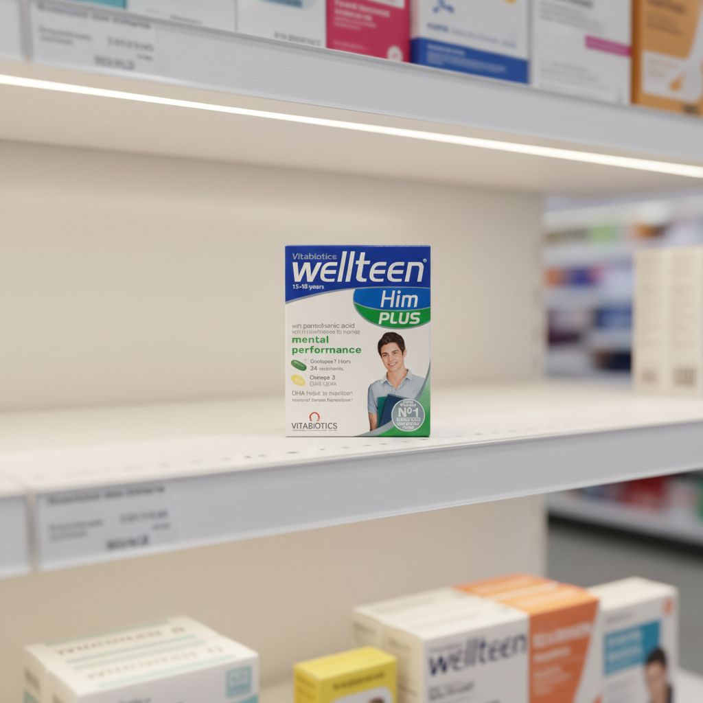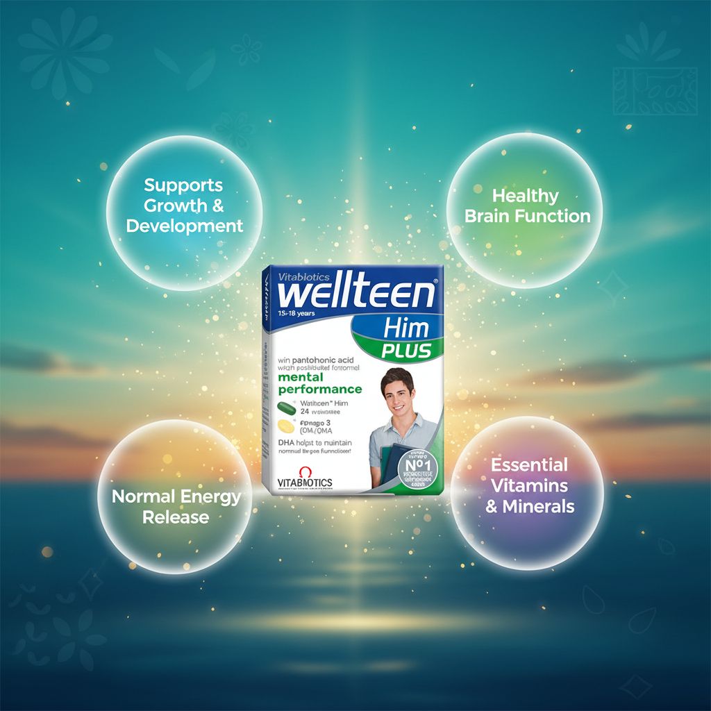 | Overview | Wellteen Him Plus provides targeted nutritional support for teenage boys aged 15–18 years during key developmental years. This dual pack combines multivitamin tablets with Omega-3 capsules to support mental performance, energy levels, and overall vitality, and is formulated by Vitabiotics to meet the specific needs of growing teens balancing studies, sports, and social activities. |